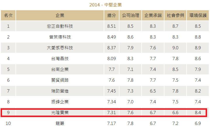 光隆獲得天下雜誌-2014年「CRS 天下企業公民」- 中堅企業組-第九名!!!